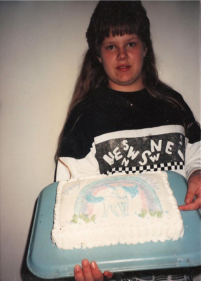You can always tell what I was into by the picture on my cake. I used to be *really* into unicorns and rainbows! (Who am I kidding, I still like that stuff) I had that haircut in 7th grade- so uhhh... 11?